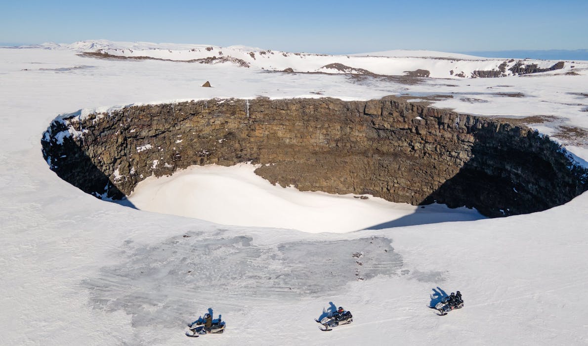 Snowmobiling passed Litla-Víti and Stóra-Víti at Þeistareykir in northern Iceland; through a landscape otherwise inaccessible for vehicles.