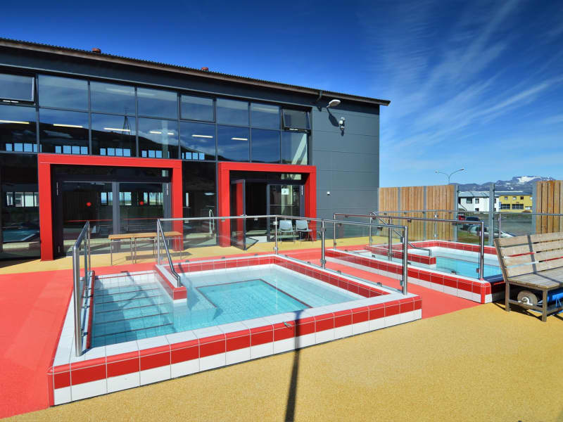 The indoor swimming pool is 12.5 metres long and has a hotpot. There is also an outdoor area with hot tubs and slides. The swimming pool is situated beside the elementary school, artificial grass pitch, football pitch and play area.